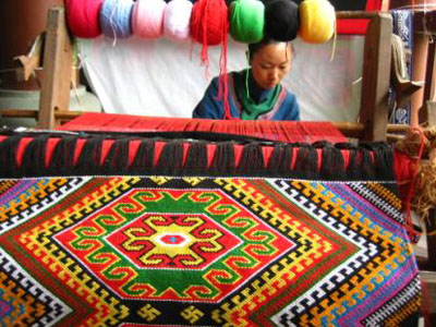 土家織錦是土家婦女用一種古老的木腰機(jī),以棉紗為經(jīng),對五彩絲線或棉線(當(dāng)今也有用毛線的) 為緯,完全用手工織成的手工藝術(shù)品。