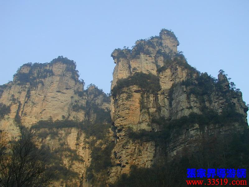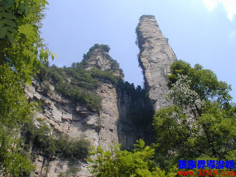 (金鞭巖、神鷹護鞭)如果要問張家界國家森林公園的標(biāo)志景點,答案是現(xiàn)成的:金鞭巖。早在清代中期,一些文人就把張家界的峰林及百丈峽列入“永定八景”。其一叫“危峽啼猿”;其二叫“層巖涌塔”:“縣西二十里青崖山,其前五山并立,層峙如浮圖。中一峰更峻拔,上插宵漢,晴輝雪積,最擅奇觀。”這里說的“其中一峰”,指的金鞭巖。八大景點張家界占其二,可見先人是有眼力的。金鞭巖相對高度380多米,拔地而起,直插云霄,無論你遠看近看,正看側(cè)看,都是一根刺破青天的長鞭!在金鞭巖左側(cè)的那座巖峰,大家看多像一只兇猛的老鷹,勾嘴瞪眼,雙翅略展,時刻警覺地守護著金鞭,人稱“神鷹護鞭”。