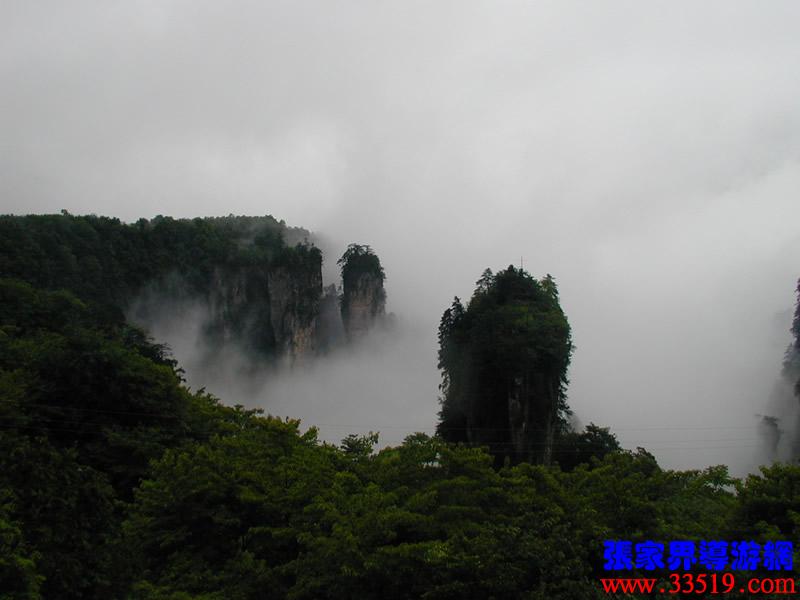 這里,我還給大家講個奇異現(xiàn)象。1991年4月的一天下午,雨過天晴,整個天子山漫開一片朦朦朧朧的薄霧,從西海到神堂灣一帶,一座座巖峰在霧中時隱時現(xiàn)。一群上海游客來到點將臺,忽然,一幅奇異的場景把大家驚呆了:神堂灣中央,七位少女從云霧中飄落到一座巖峰峰頂?shù)钠脚_上,飲茶、撫琴,翩翩起舞達40分鐘之久。游客們起初以為是一種幻覺,揉揉眼睛再看,仍然是三綠四紅,長發(fā)披肩,體態(tài)婀娜,舞步輕盈。直到“仙女們”隨一片云霧漸漸隱去的前一秒鐘,大家仍然不敢弄出半點聲響,有相機的就拼命按快門。遺憾的是距離太遠了,當(dāng)晚將膠卷取去沖洗,什么也沒留下。消息傳開后,有人相信,有人不相信。其實,神話也好,事實也好。這種奇異現(xiàn)象完全可用科學(xué)去解釋。“海市蜃樓”這是人所共知的;而大沙漠中不也經(jīng)常出現(xiàn)綠洲、村莊、城市么?