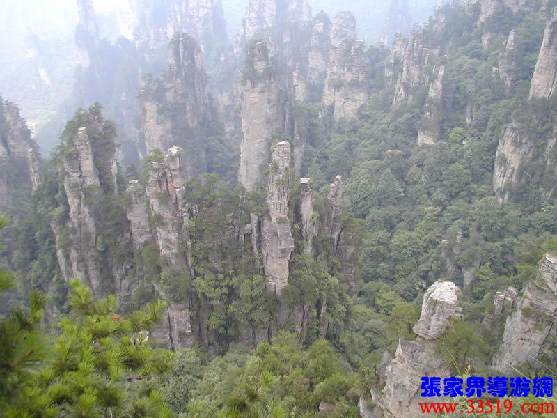 (大觀臺)這就是大觀臺。極目遠眺,千百座奇峰盡收眼底。一位詩人說,武陵源的砂巖峰林是一步一觀景,千步千造型,一山有四季,十步不同天。專家測算出武陵源石峰有3103座。一如一位高超的雕塑大師,模擬宇宙萬物,無不形狀逼真,維妙維肖,栩栩如生,呼之欲動。有的如海螺出水,有的如金龜銜日,有的如蓮花盛開,有的如天橋橫空,有的如長槍刺天,有的如寶塔聳立,有的如老人采藥,有的如玉女梳妝,有的如將軍出征,有的如戰(zhàn)馬長嘯,有的如情人幽會,有的如夫妻相擁,有的如仙女散花,有的如村姑守望.....有的孤峰獨秀,有的直插云霄,有的婷婷玉立,有的威武勇猛,有的小巧玲瓏,有的大氣磅礴。進入武陵源,但見一片峰的森林,峰的世界,峰的海洋。挺拔、奇秀、集中、原始、粗獷、古野。這就是武陵源。一位藝術(shù)大師說:武陵源的山峰,改寫了山的概念。大攝影家陳勃說:“三山五岳堪比美,華夏風(fēng)光每一流。”王繼杰先生說:“武陵源上三日游,勝讀千篇李杜詩。”許世杰先生說:“秀幽險峻稱奇絕,五岳黃山拜下風(fēng)。”李成瑞先生為此大抱不平:“神州勝景誰為最?須請霞公重評勘。”可惜徐霞客無緣到大觀臺來,也不可能為武陵源作甚評價了。