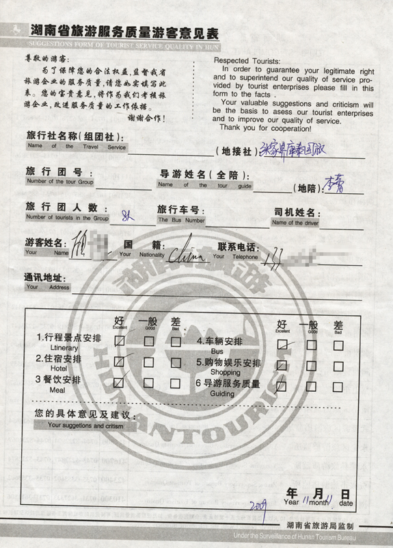 2009年11月11日顧先生一行8人旅游接待質(zhì)量反饋單