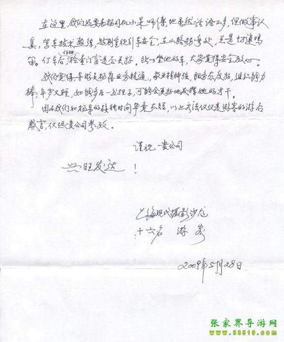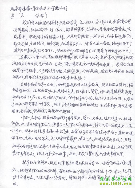 2009年5月19日“上?,F(xiàn)代攝影沙龍”一行16人,參加張家界旅游導(dǎo)游網(wǎng)組織的張家界旅游跟團,于2009年5月25日結(jié)束行程。游玩期間,由于導(dǎo)游楊蓓的出色講解和周到的服務(wù),得到客人的一致好評??腿颂丶谋頁P信一封,如下: