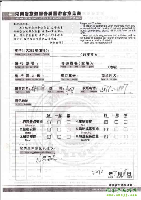 2010年7月7日朱先生旅游質(zhì)量反饋:非常滿意