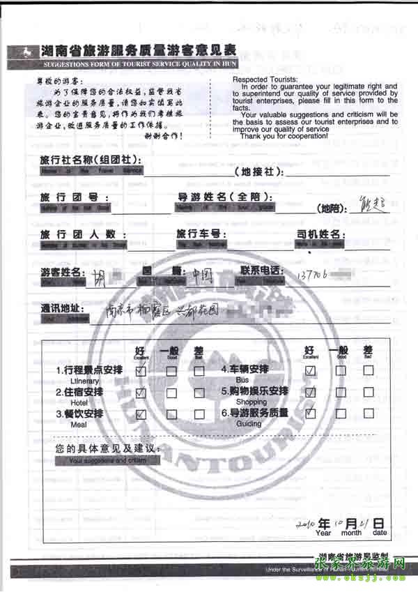 2010年10月21日胡先生旅游質量反饋