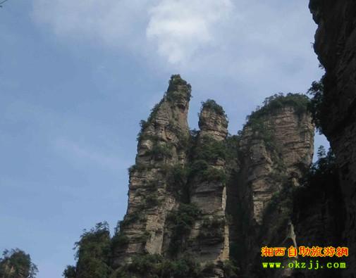 什么?有人說夫妻巖是兩個(gè)石頭啦。那旁邊的那個(gè)石頭是第三者?我暈,佩服你們的想象力啊。夫妻巖位于黃石寨對面山頭,張家界山莊后,在田家臺的對面,有兩個(gè)自然生成的山峰。這山也真奇,一個(gè)象男,一個(gè)象女,頭挨著頭,身靠著身,有眼睛,有鼻子,有頭發(fā),有嘴唇,就連眉毛與牙齒,也看得清清楚楚,明明白白。他倆站在高山,立在神地,相親相愛,永不分離。相傳,這是花仙山荷花與養(yǎng)蜂人田花郎歷盡千辛萬苦,幾度起死回生結(jié)合而成的,如遇自己的紅顏知己,可以去此處看看,許下心愿可保夫妻和睦,家庭幸福。